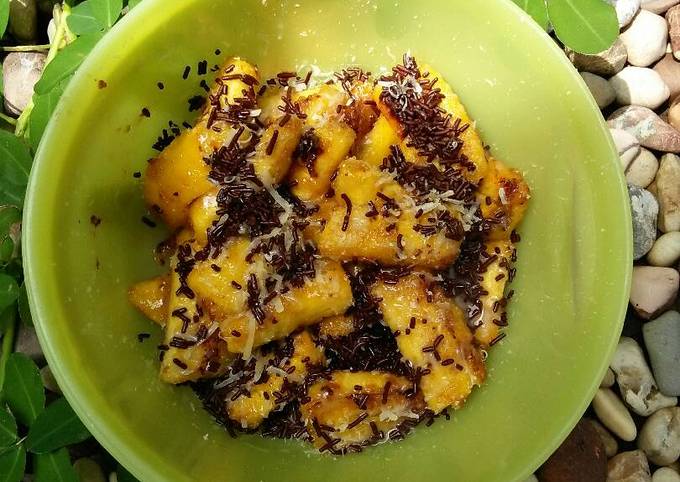 2 buah pisang matang. 1 sisir pisang raja Keju parut secukupnya. Resep Goreng Pisang Crispy Tabur Keju Bahan-bahan.